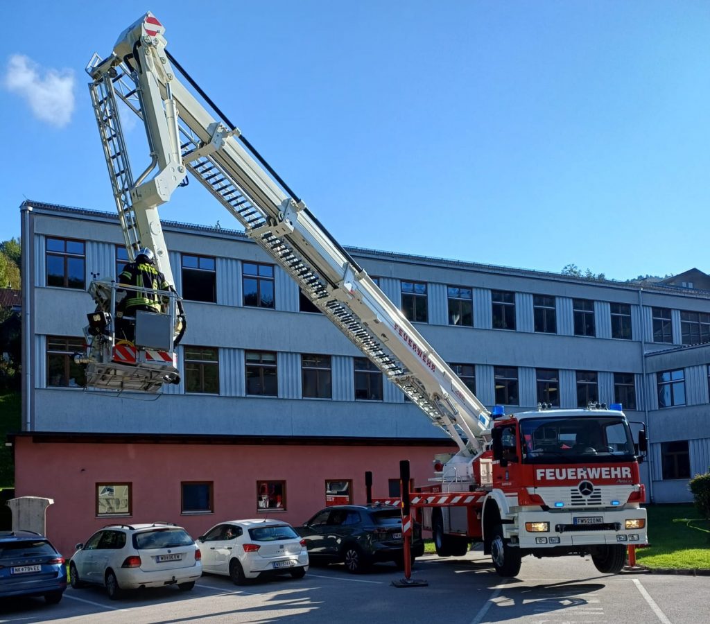 Mit dem Hubsteiger der FF Neunkirchen wurden mehrere Schulklassen über die Fenster evakuiert.